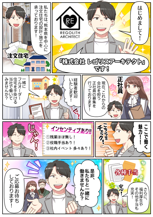 | 必須条件 | ◎高卒以上 ◎PCスキル(Word/Excel/Powerpoint) 以下の経験のある方は優遇 ◎住宅営業経験者 ◎建築系学部・学科卒者 ◎建築に関する実務経験 |